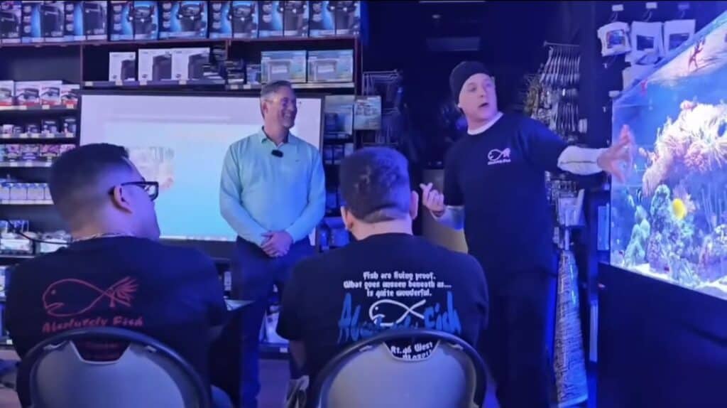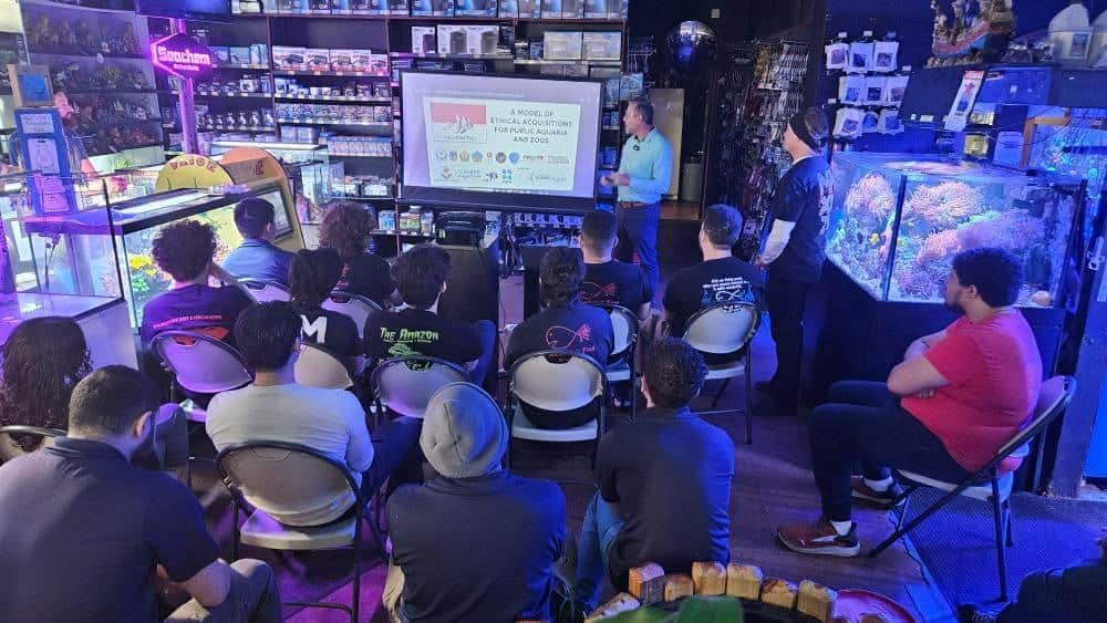 discussed the goals of his organization; to promote sustainable aquarium fisheries and to