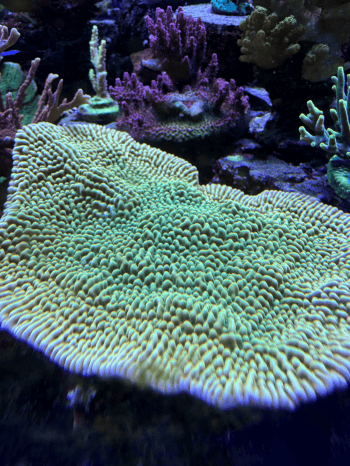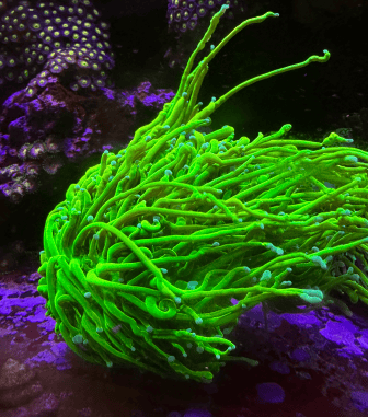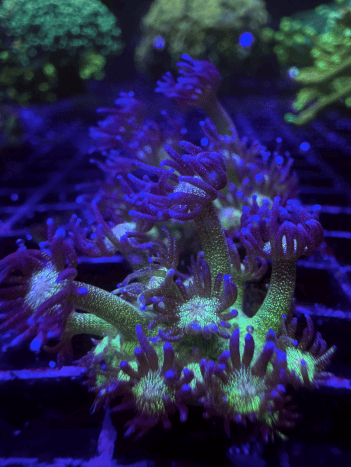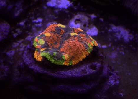 These ethereal and spectral corals make me think of a fairy garden. It looks like Tinkerbell just flew over these LPS corals and sprinkled them with pixie dust. These Gonis are special due to their bright fluorescent speckles. Glitter Gonioporas are a beautiful addition to any tank to add not just that pop of bright color, but a unique patterning and texture to your aquascape as well. If you’re looking for a touch of whimsy in your reef aquarium, this coral might be for you! Gonioporas require a very well established tank to thrive and stable water parameters. They do best in moderate light and low to moderate flow in a higher nutrient system.